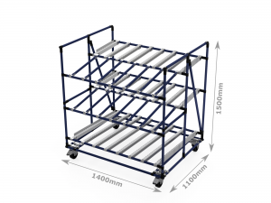 In this example, parts are presented directly beside the operator using a modular flow rack and material trolley.